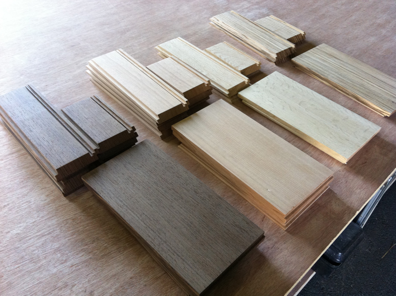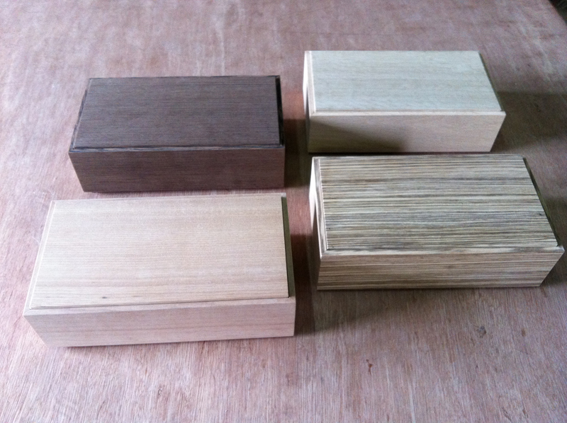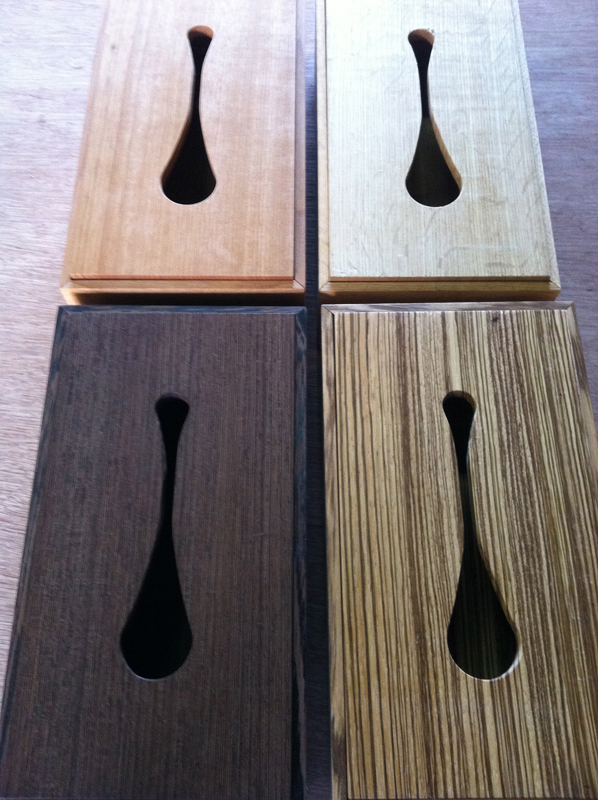 それぞれ違う色の木をわざと選んで今回作ってみました。塗装は全てクリアオイルなので自然の木の色です。着色は一切していません。一言で木と言っても種類や原産国で少しずつ違います。また、違うのは色だけではなく、匂いや切ったり削ったりする加工性も違ってきます。特に一番左のウエンジはポロポロと欠けやすく穴開けに苦労しました。