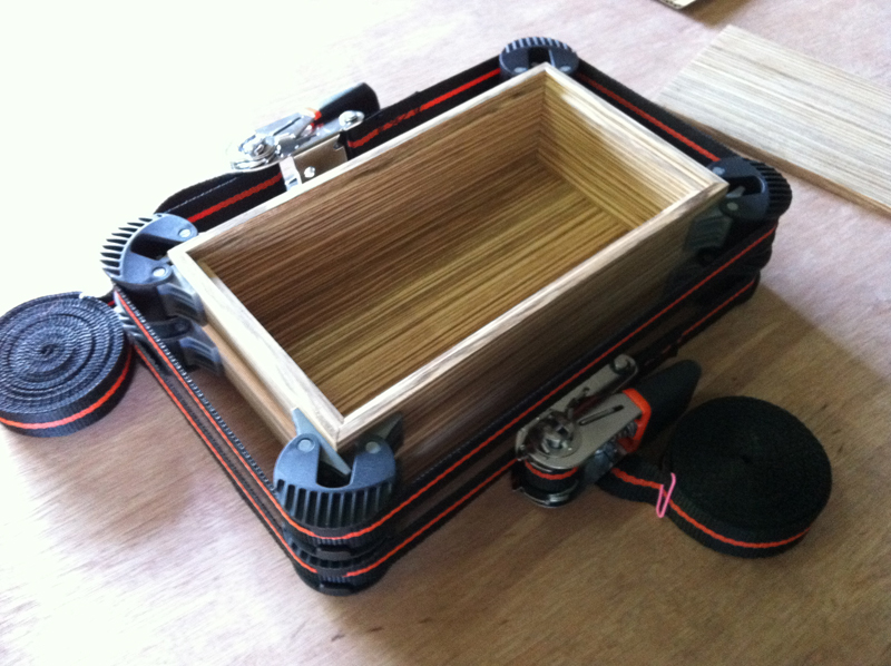 組み立ては糊をつけ、ベルト状のクランプで縛ります。額をなど作る時にも使います。
