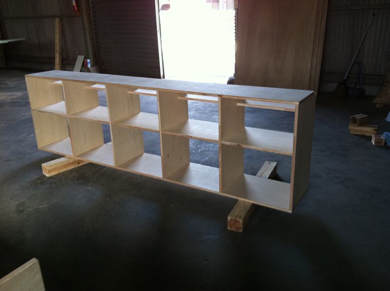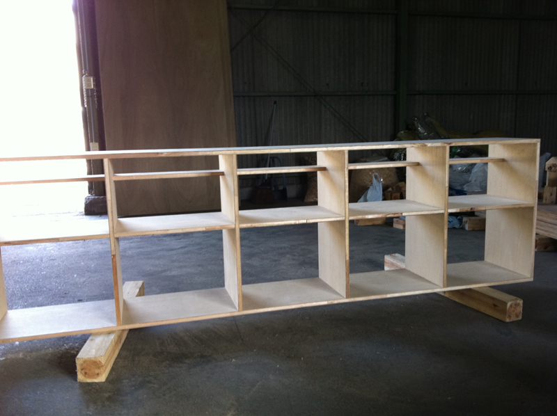 ランバーコアだけの収納棚です。長さ2.4mの棚を一人で作るだけでも汗だくです。これを3台。