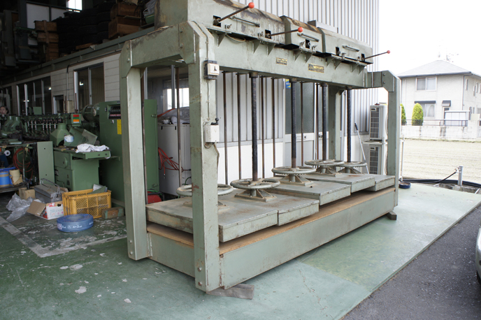 シリーズ最初はプレス機。圧着する機械です。木工の接着は主にのりで行います。鉄は溶接ですね。皆さんも一度は使った事があると思う木工用ボンドを使います。もちろん種類は多種多様で普通の木工用ボンドから2つの液体を混ぜて使う2液タイプのもの、瞬間接着剤やスプレーで吹き付けて使うタイプものと様々です。そのどれもが圧着といってのりが固まるまでしばらく押さえつけたまましなければなりません。それをしてくれるのがこのプレス機です。