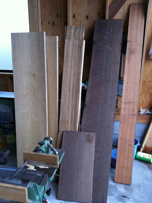 昨日の続きですが、左から3番目の木はウエンジです。色は黒に近いぐらい濃い材料です。木目が真っ直ぐです。しかし、若干脆く粘り強さがありません。