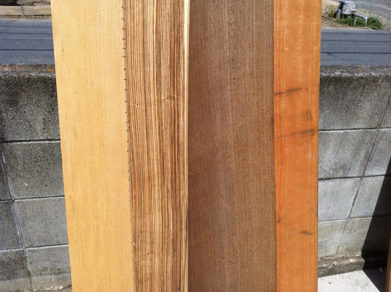 最後に一番右の材料はマコレです。別名チェリーマホガニーやアフリカンチェリーなどと呼ばれます。今回赤い材料が欲しかったので選びました。木目は通直なので奇麗な色が出ると思います。