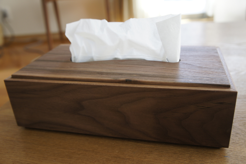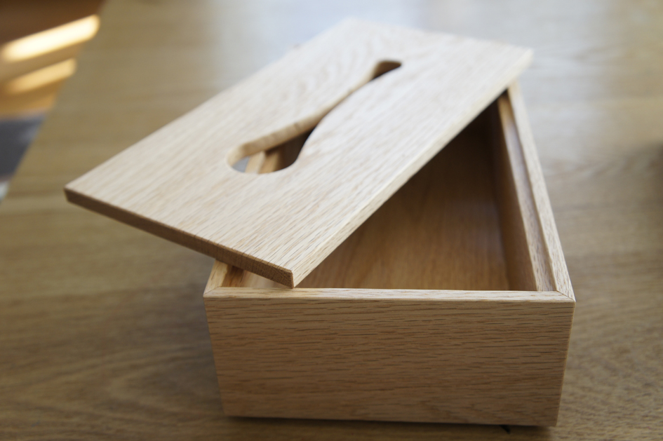 そのほかの特徴は天板・底板まで全て無垢材で出来てます。一般に木製のティッシュケースはフタと底の部分は突板(つきいた/表面に薄い木を張ったベニヤ板)やポリ合板(白や黒、その他色を付けた板)等です。なぜそうするかというと、コストと無垢材は薄くすると反りやすいからです。kuusiではキチンと乾燥させた材料を使い、反らないようにする為の手間をかけてます。